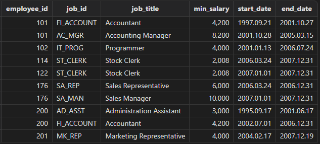 查找各职员的工作历史信息,测试各类型的表进行关联查询的兼容性情况。