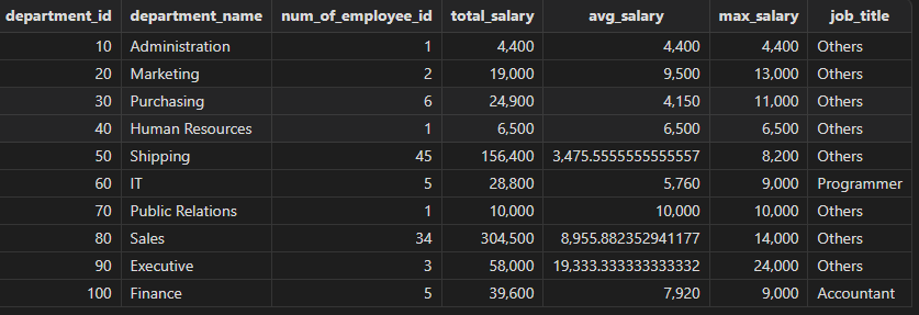 下面示例以 Oracle 模式按部门统计职工薪水情况,包括部门信息、职工人数等: