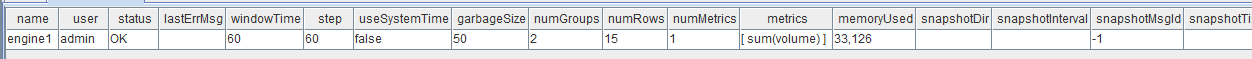 - getStreamEngineStat:可以查看系统中定义的全部流计算引擎、各个引擎的内存占用等状态,每一类引擎对应一张表。