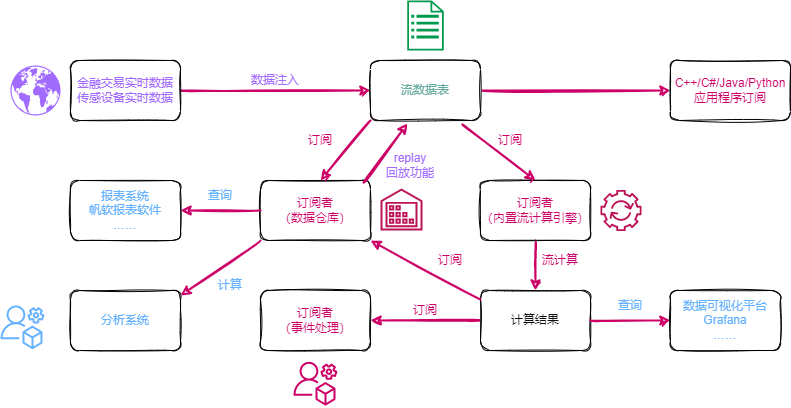 - 可由流数据计算引擎订阅,进行计算,并将结果输出到流数据表。计算结果既可以由Grafana等平台进行实时展示,也可以作为数据源再次发布,供二次订阅做事件处理。