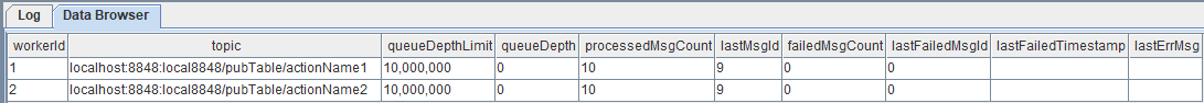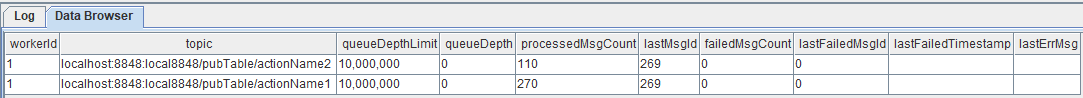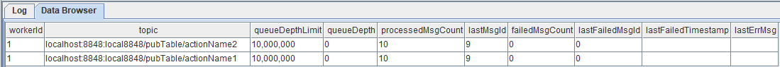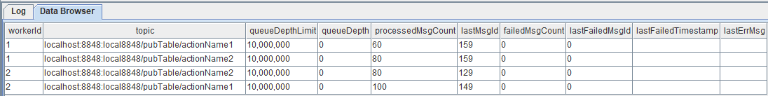 getStreamingStat获取persistWorkers表。这张表的记录数等于persistenceWorkerNum配置值。若要并行处理持久化数据表的任务,可设置persistenceWorkerNum>1。 - subWorkers:表监控流数据订阅工作线程。当有流数据进入时,可以通过该表观察到已处理数据的信息。