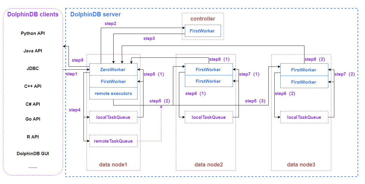 本教程以一个分布式 SQL 查询为例,介绍 DolphinDB 分布式数据库查询过程的数据流,以及其经历的各类线程池。