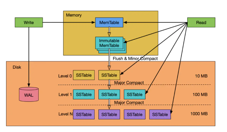 LSM-Tree 是一种分层、有序、面向磁盘的数据结构,主要用于处理写入密集型的工作负载,如日志系统、实时分析系统和数据库等。其实现的核心思想是利用磁盘批量顺序写入大幅提高写入性能。其工作流程图如下所示: