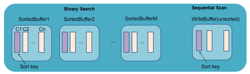 CacheTable 分为两个部分:首先是 write buffer,数据刚写入时会追加到 write buffer 的尾部,该 buffer 的数据是未排序的。当 write buffer 超过 TSDBCacheTableBufferThreshold 的配置值(默认 16384 行),则按照 sortColumns 指定的列排序,转成一个 sorted buffer (该内存是 read only 的),同时清空 write buffer。