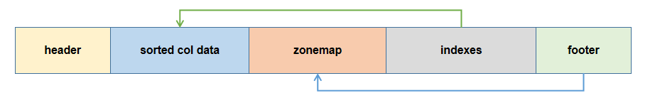 内存索引包含两个部分:sortKey 维护的 block 的偏移量信息(对应 Level File indexes 部分),zonemap 信息(对应 Level File zonemap 部分)。