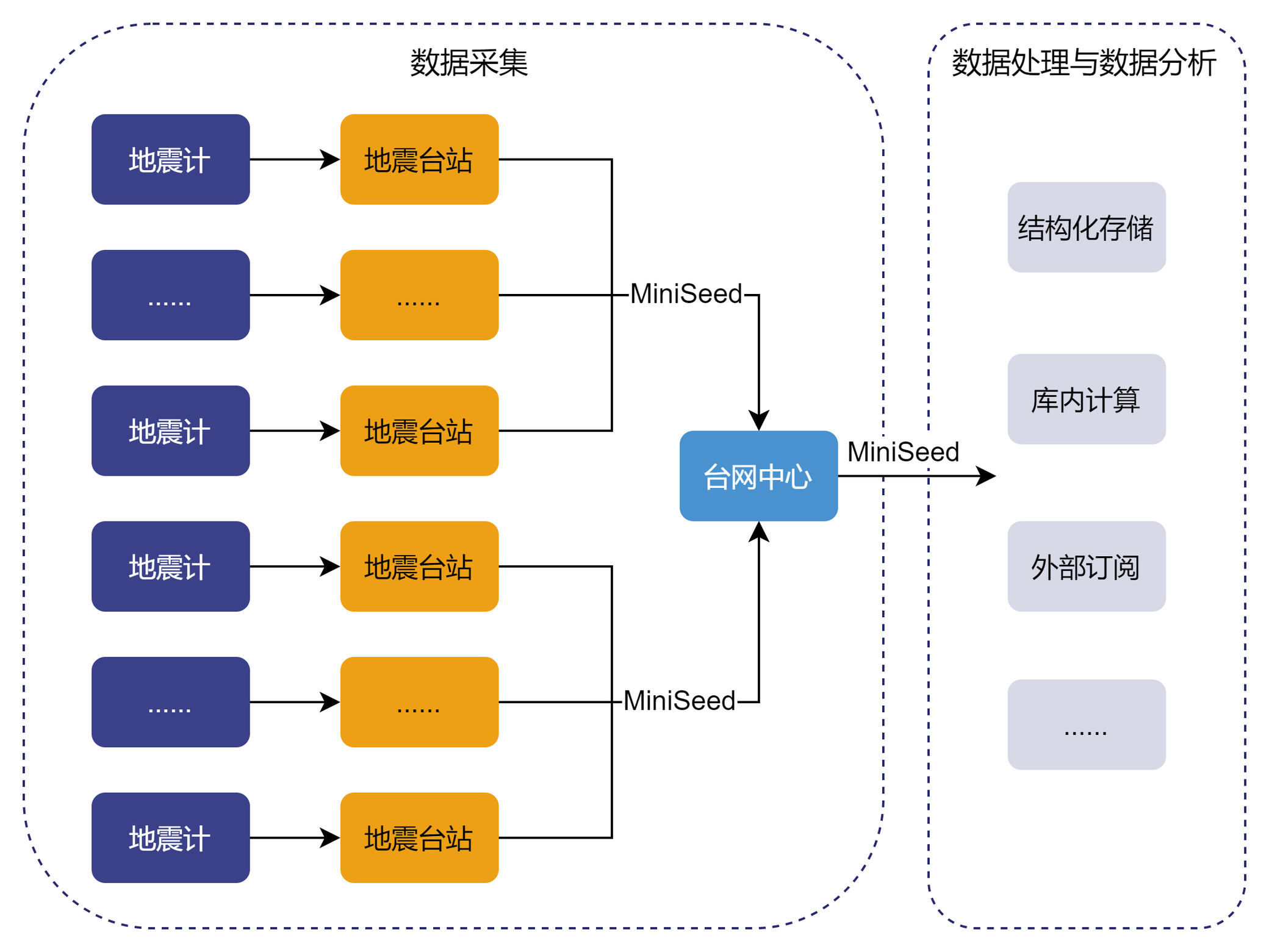现今大部分测震数据是以 SEED 文件格式或存储于盘阵内,或存储于光盘、移动硬盘等离线介质内,辅以数十张描述这些数据文件的关系型表,这些表遵从《中国数字测震台网数据规范》。有数据分析需求的研究人员通过网络等方式进行数据申请,数据服务方按照请求进行波形数据的截取和打包,并发送给研究员。