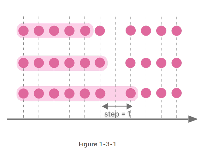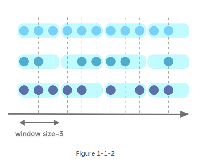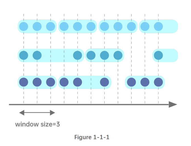 图1-1-1 指定窗口长度为3行记录,横坐标以时间为单位。从图上可以看出,按每三行记录划分为了一个窗口,窗口之间的元素没有重叠。