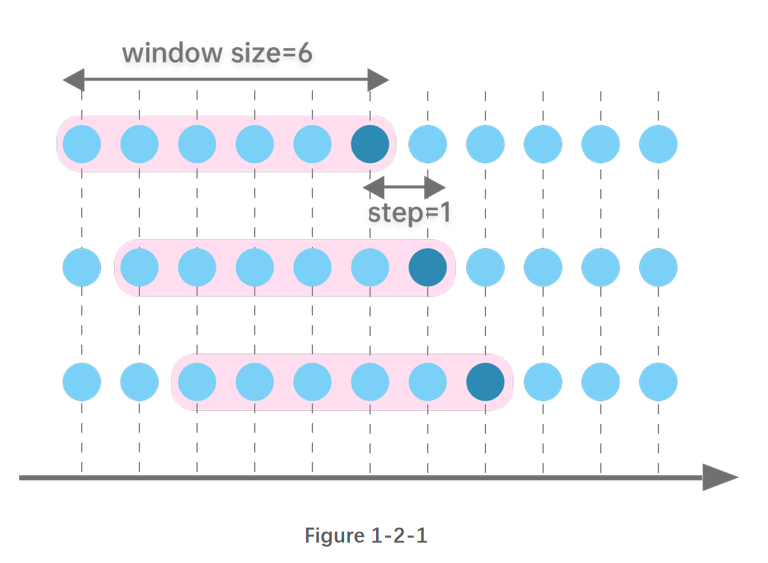 图1-2-1 指定窗口大小为6行记录,窗口每次向后滑动1行记录。