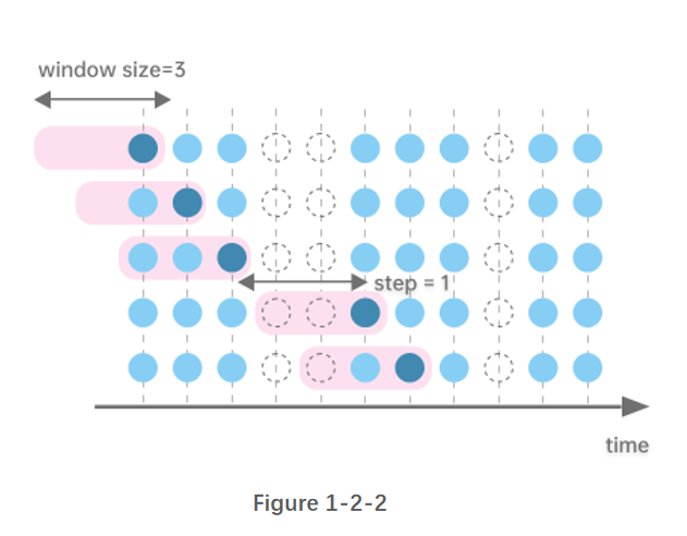 图1-2-2 指定窗口大小为3个时间单位,窗口以右边界为基准进行前向计算,窗口每次向后滑动1行记录。