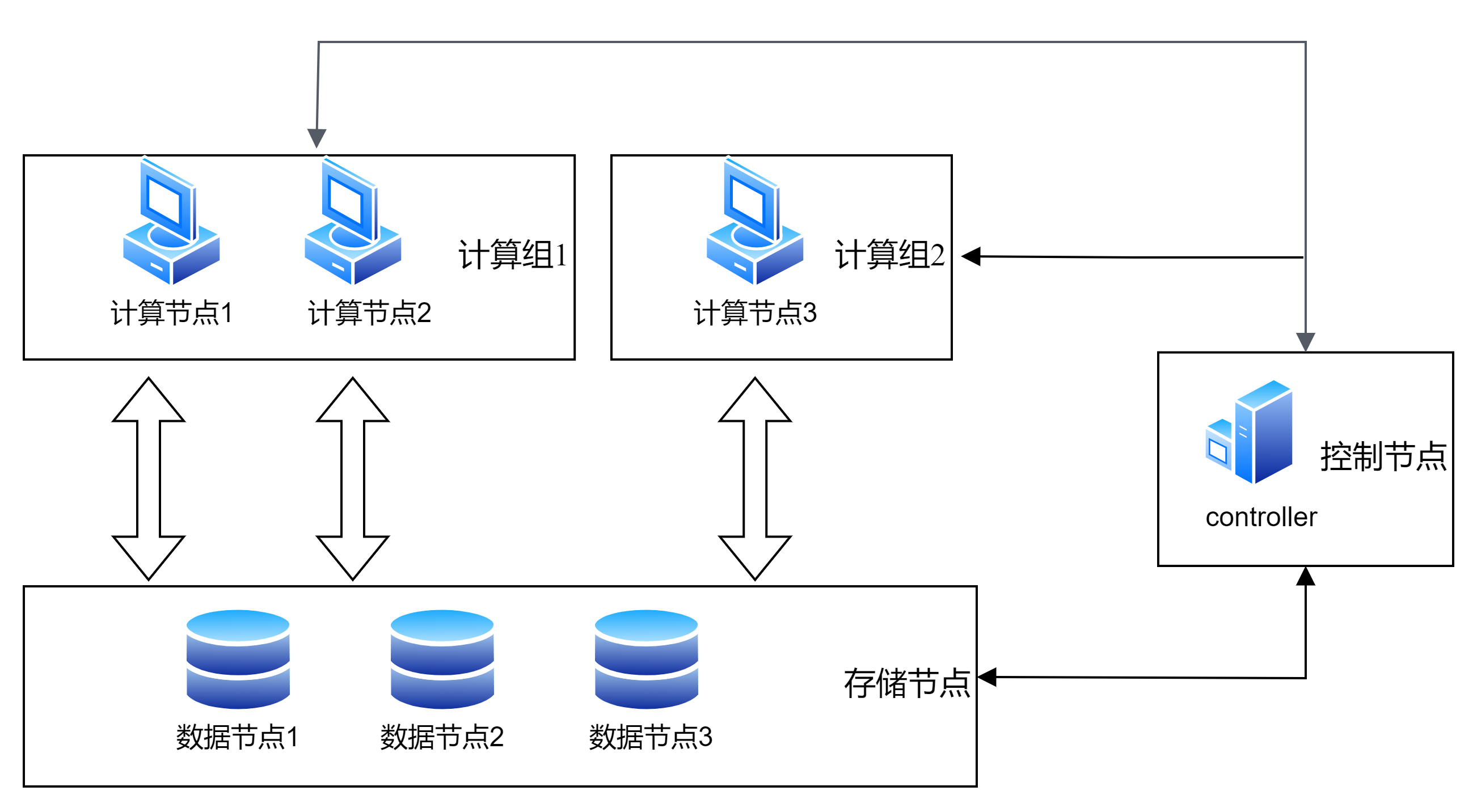在 DolphinDB 存算分离架构中,集群包含的节点类型与存算一体架构相同。不同之处在于,前者需要配置计算组,并为每个计算组指定相应的计算节点。存算分离结构集群构成图如下所示: