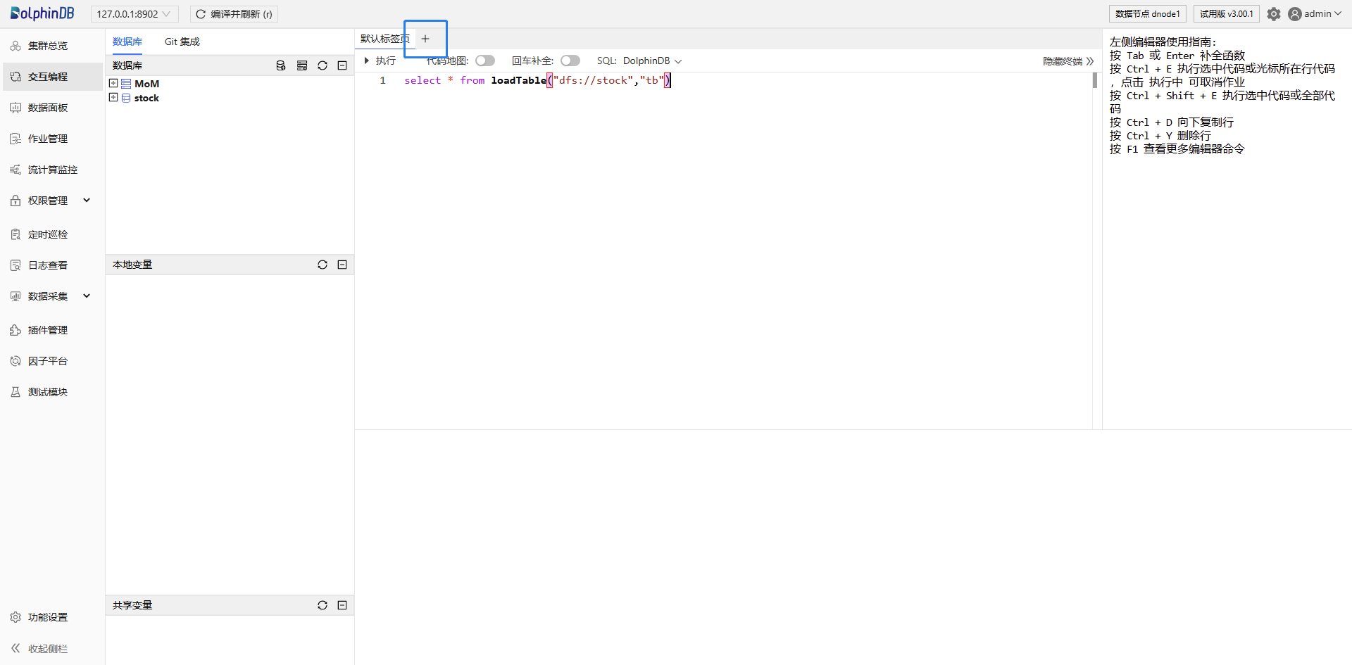 点击编辑器区域上方的 + 按钮即可创建一个新的标签页。每个标签页都代表一个独立的代码编辑和存储区域,可以在其中编写和执行不同的 DolphinDB 脚本。