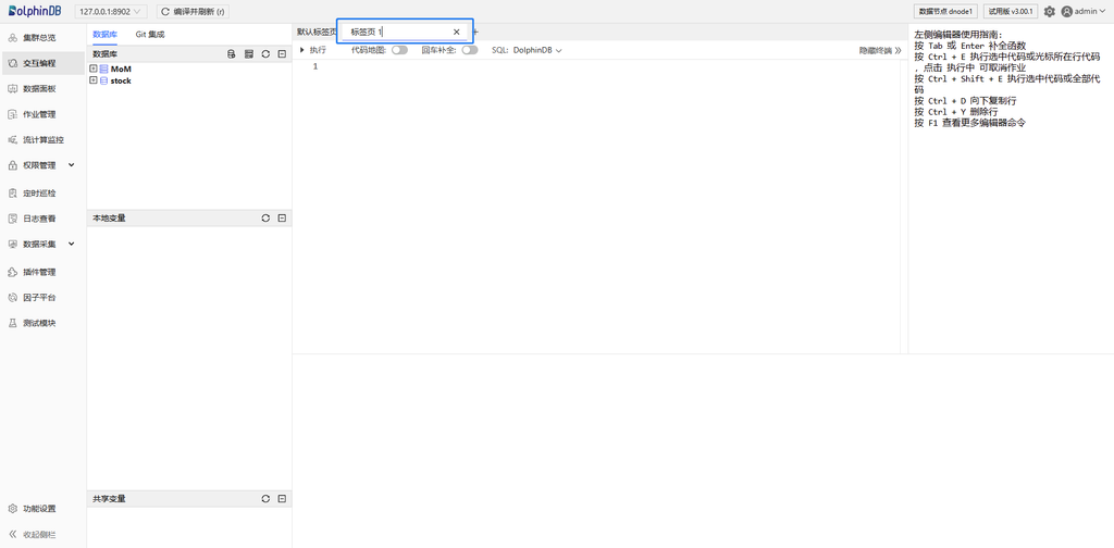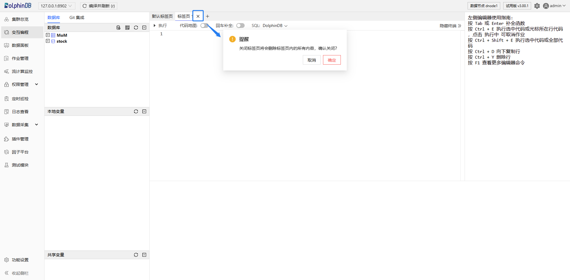 DolphinDB Web 集群管理器自 v3.00.2.1 起支持配备了多标签页编辑器,支持使用标签页管理交互编程中的代码,用户可以像使用现代浏览器一样轻松管理多个 DolphinDB 脚本。