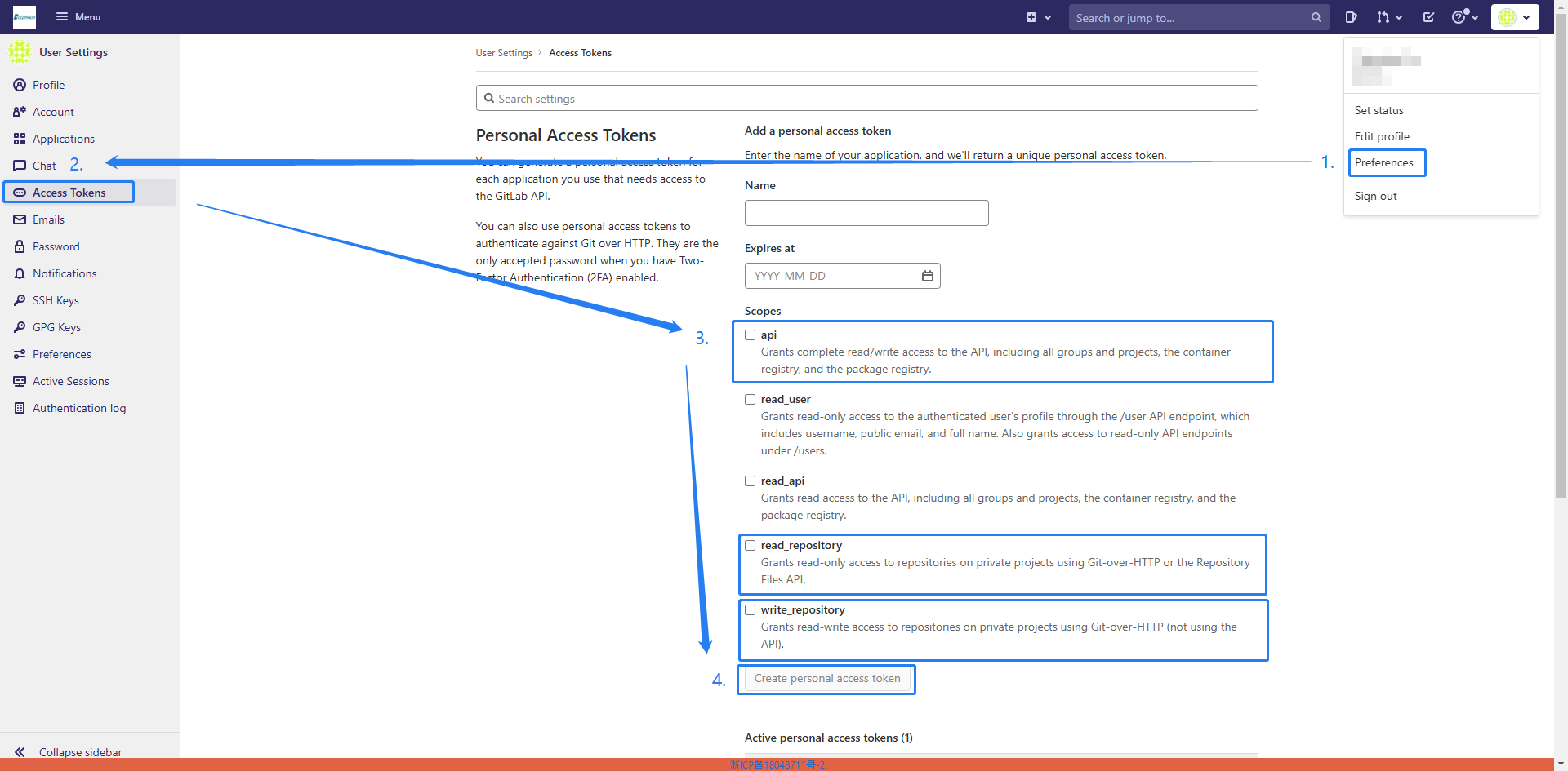 - 获取 GitLab Personal Access Token (Personal access tokens |