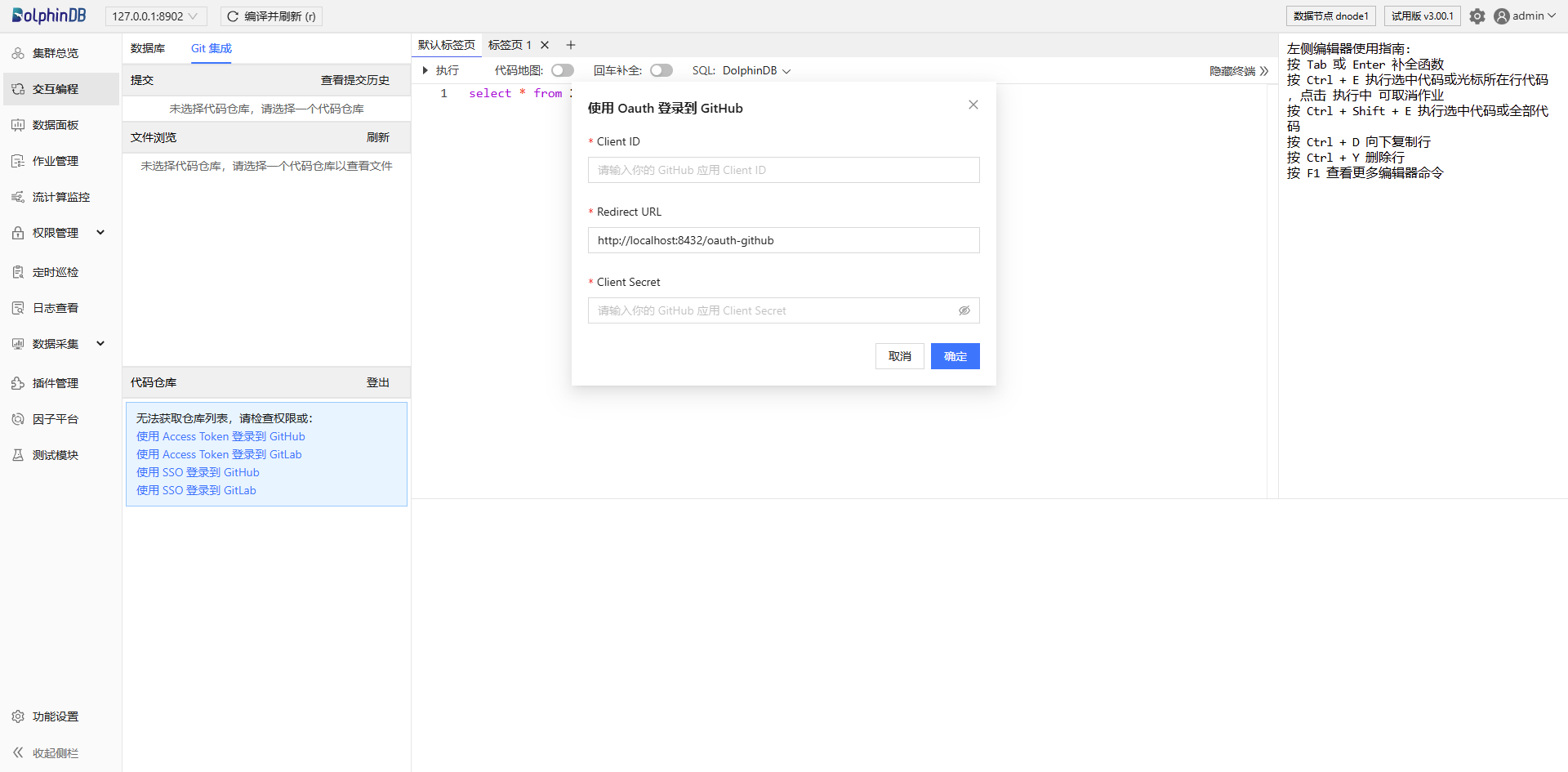 DolphinDB Web 集群管理器自 v3.00.2.5 起支持 Git 集成,可直接连接到 GitHub 或 GitLab 仓库,实现脚本的版本控制、协同编辑和便捷的代码同步。