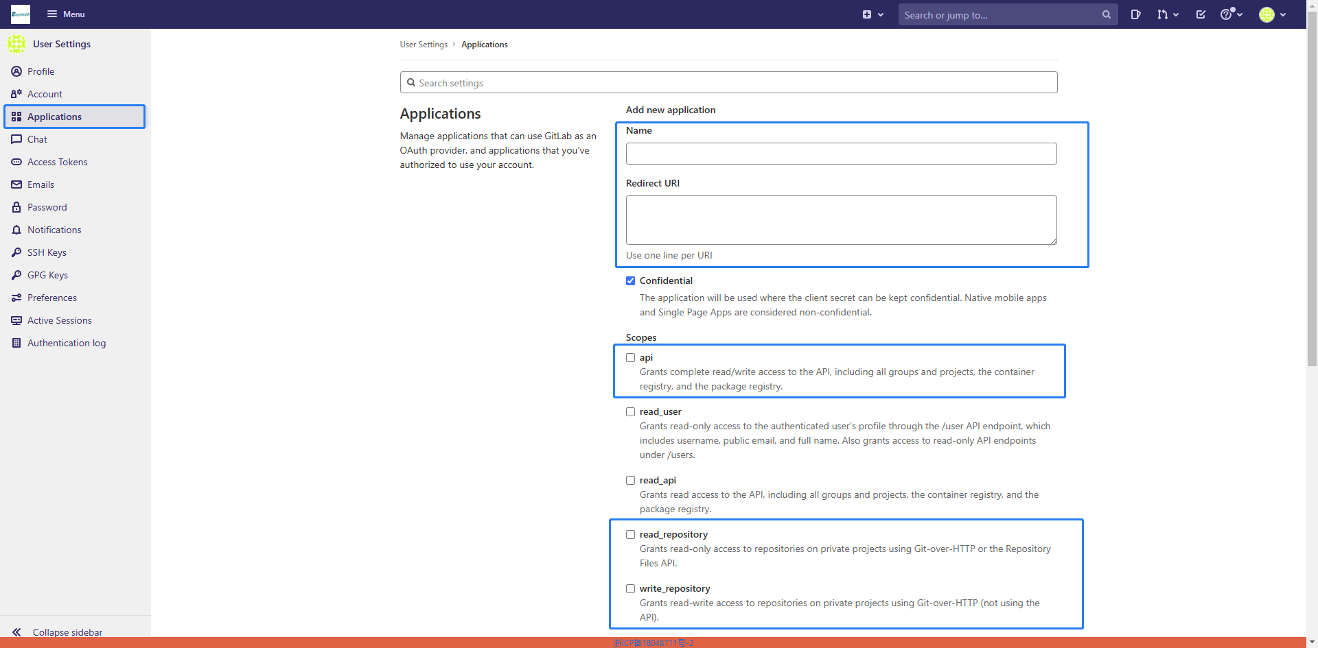 在 GitLab 中创建一个 Application (Create a user owned application),获取 Application ID (即 Client ID)。