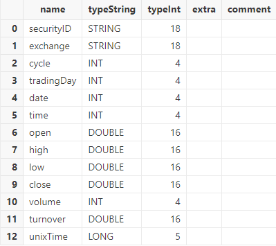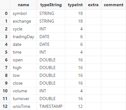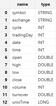调用 schema 函数查看表结构。可以发现,导入的 tradingDay 列和 date 列的数据类型为