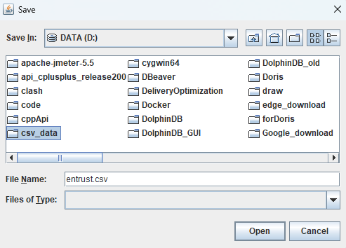 点击标签栏的导出CSV图标。在白色框中写入需要数据查询的语句,以分布式数据库 "dfs://SH_TSDB_entrust" 库下 ”entrust” 表为例,导出前 10 行数据,如下所示: