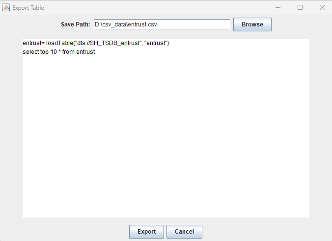 以分布式数据库 "dfs://SH_TSDB_entrust" 库下 ”entrust” 表为例,导出前 10 行数据保存到服务器端路径 “/home/appadmin/hmy/data/entrust.csv”,函数详见 saveText,语句如下
