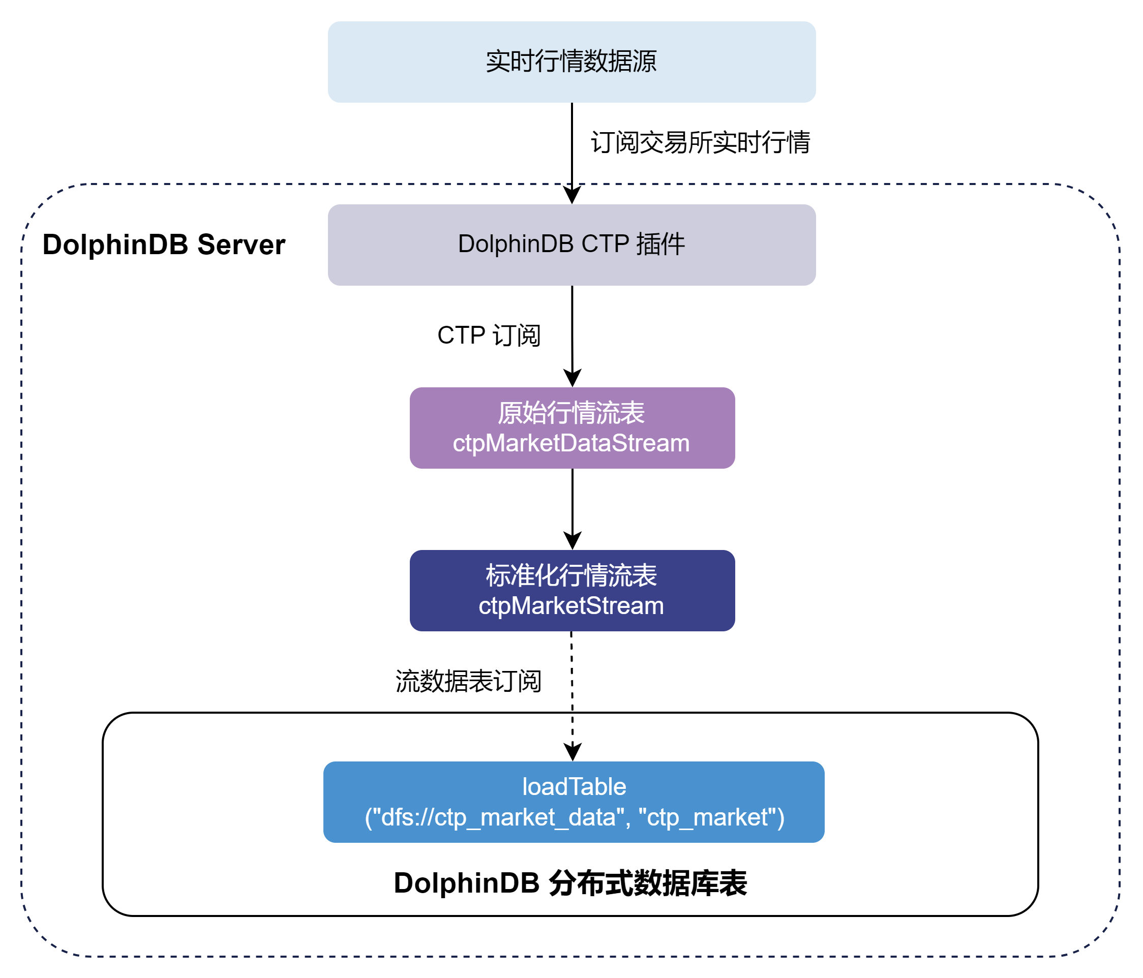 - 通过 CTP 插件订阅实时交易数据写入 DolphinDB ctpMarketDataStream 持久化流数据表中。流数据表是具备发布订阅功能的内存表。