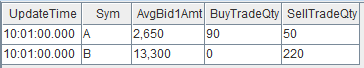 share streamTable(1:0, `UpdateTime`Sym`AvgBid1Amt`BuyTradeQty`SellTradeQty, [TIME, SYMBOL, DOUBLE, LONG, LONG]) as output