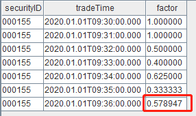 结果表对应地新增了一条记录,且对于09:36:00这条记录,计算得到了正确的 factor 值: