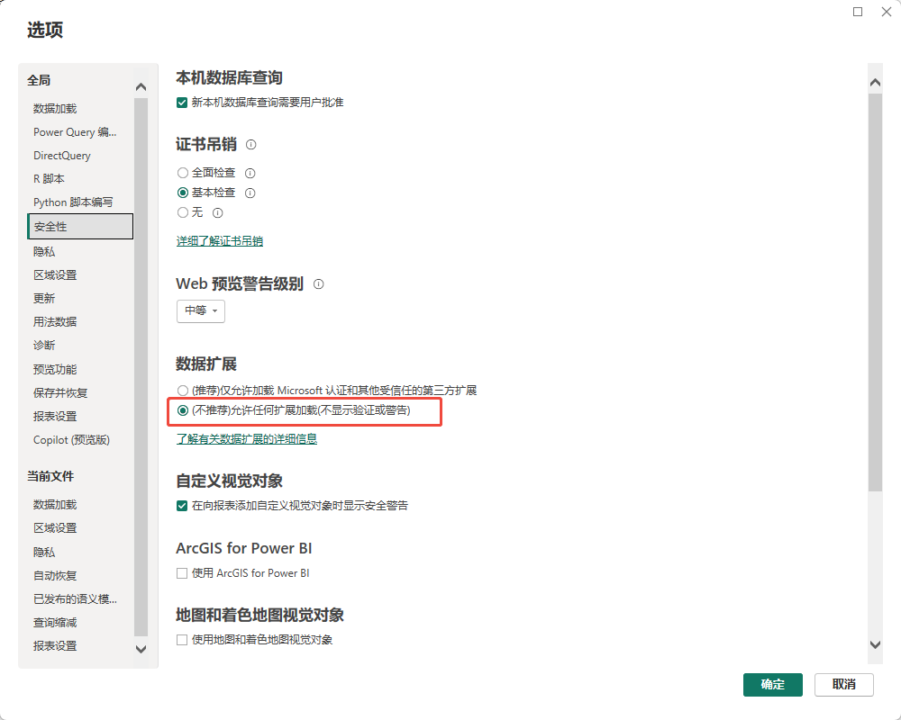 启动 Power BI Desktop,依次选择 “选项和设置” > “选项” > “安全性”。在 “数据扩展” 下,选择 “(不推荐)允许任何扩展加载(不显示验证或警告)”。点击 “确定”,然后重启 Power BI Desktop。