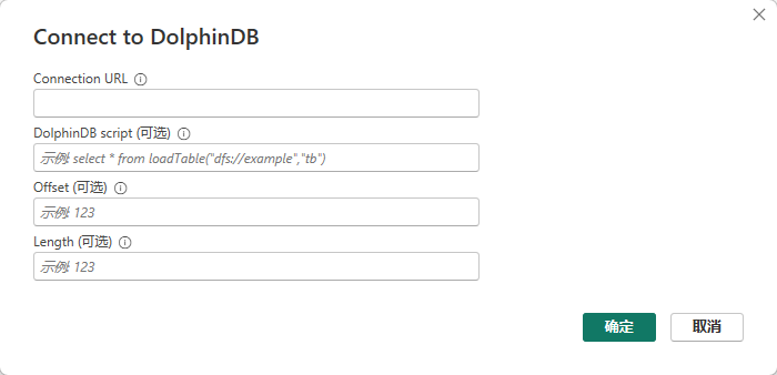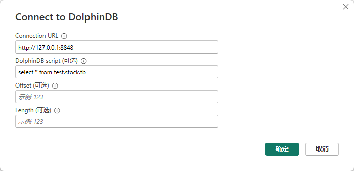 在连接设置页面中输入Connection URL、DolphinDB script、Offset 和 Length。