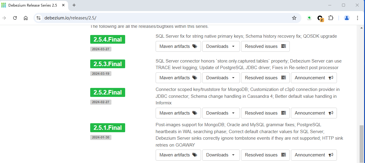 前往官方网站 Debezium,选择 2.5.1.Final 版本进行下载,程序名为 debezium-connector-postgres-2.5.1.Final-plugin.tar.gz,本教程测试时采用的此版本,也可以使用 2.5 系列的最新版本。如果想使用 Debezium 的最新稳定版本,需要仔细阅读对应的版本需求,并进行详细测试。