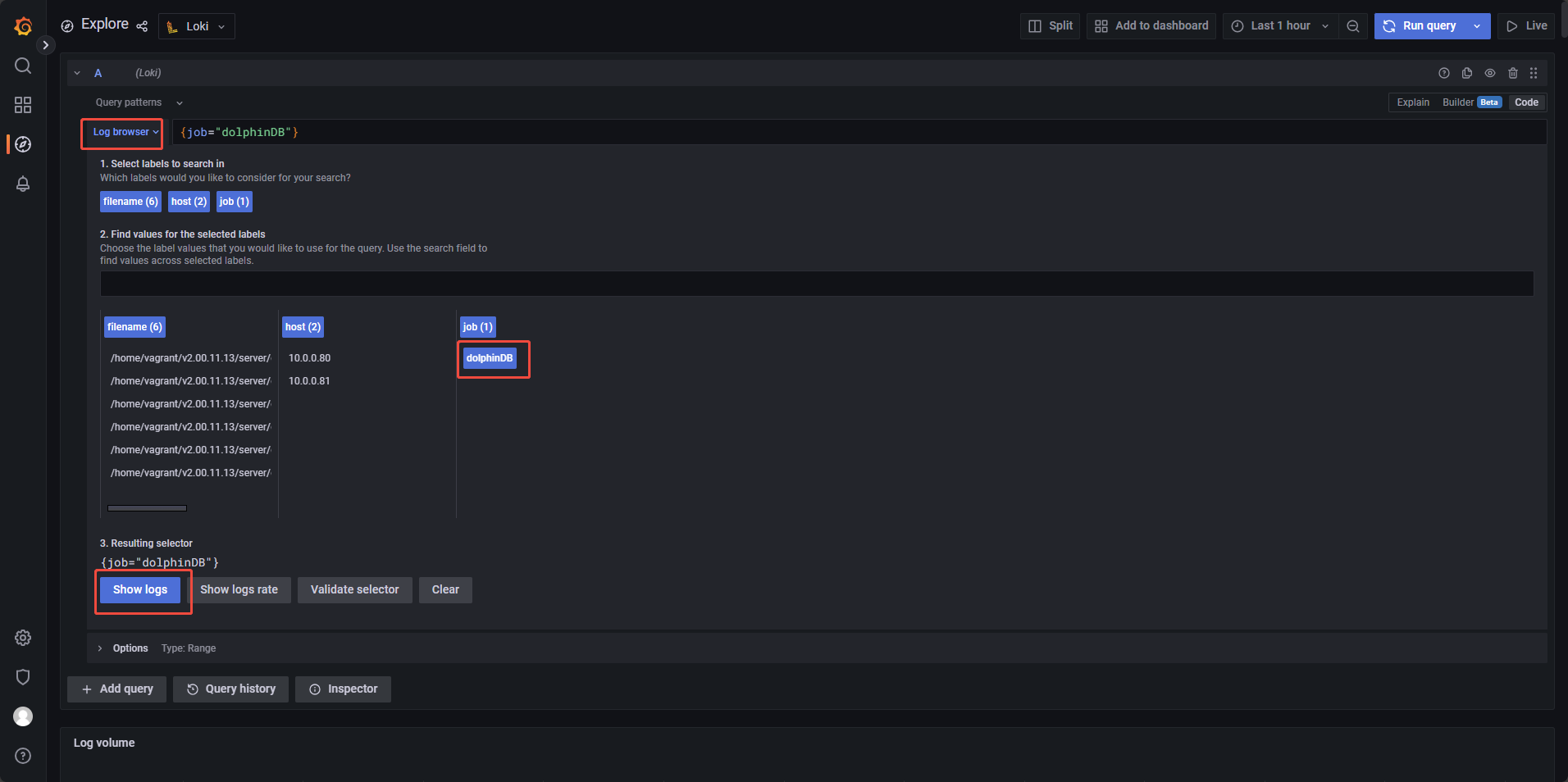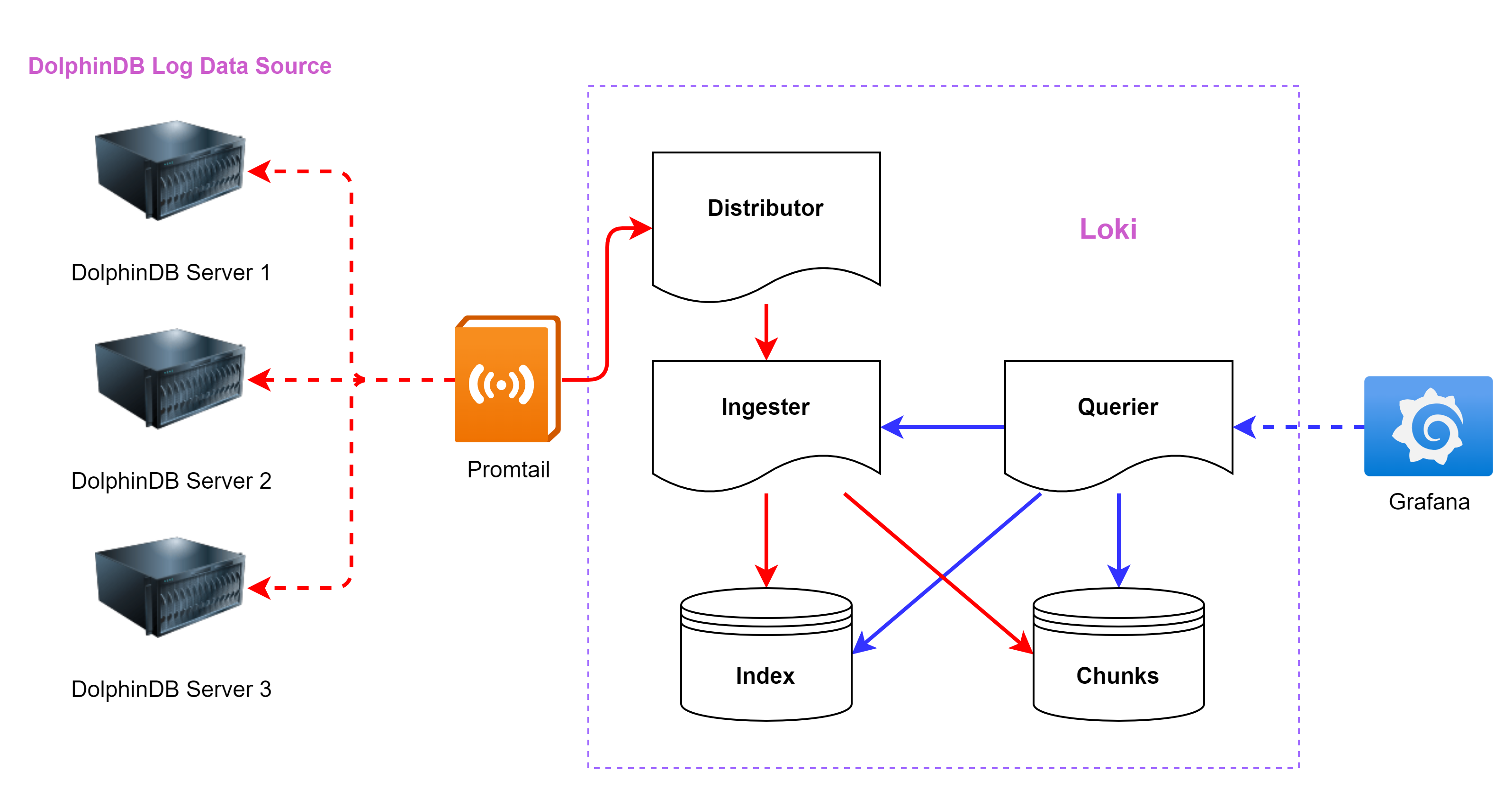 - Promtail 是一个用于日志采集和推送的代理工具,负责从数据源(如 DolphinDB)抓取日志,将日志中的关键字解析为标签以便分类和过滤,并将日志以流的形式通过 HTTP API 推送到 Loki,供进一步存储和查询。