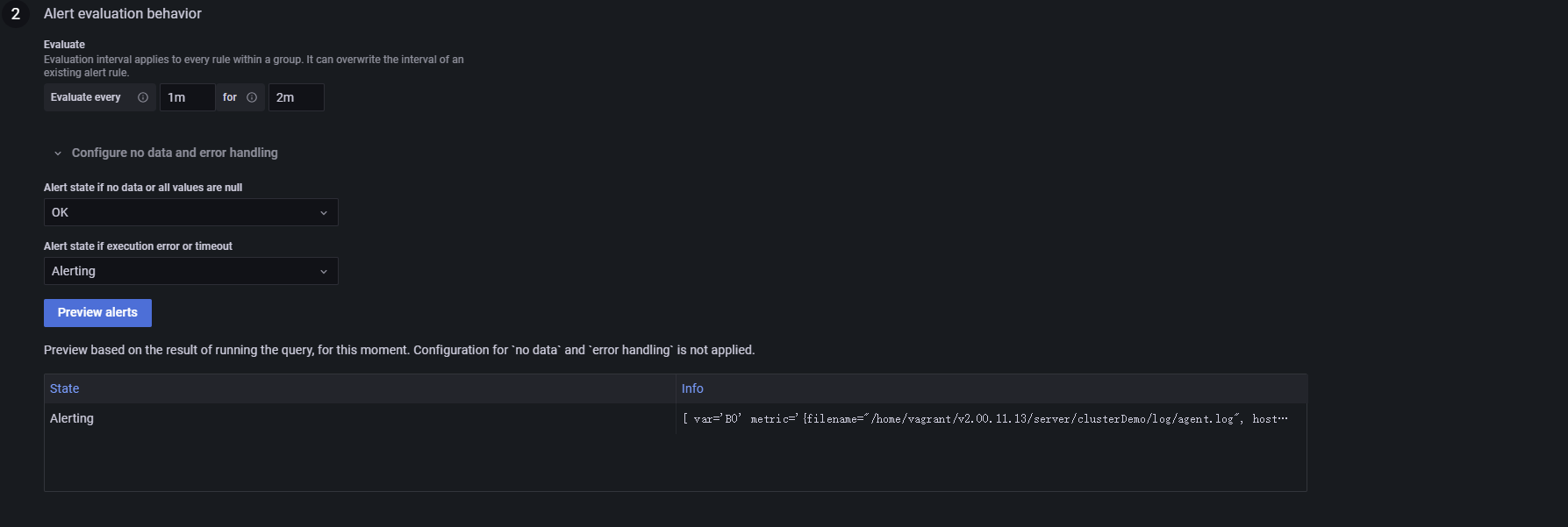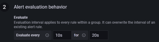 - 设置检查频率与评估期时长,其中 Evaluate every 1m 代表每 1 分钟检查一次;for 2m 代表评估期设置为 2 分钟;