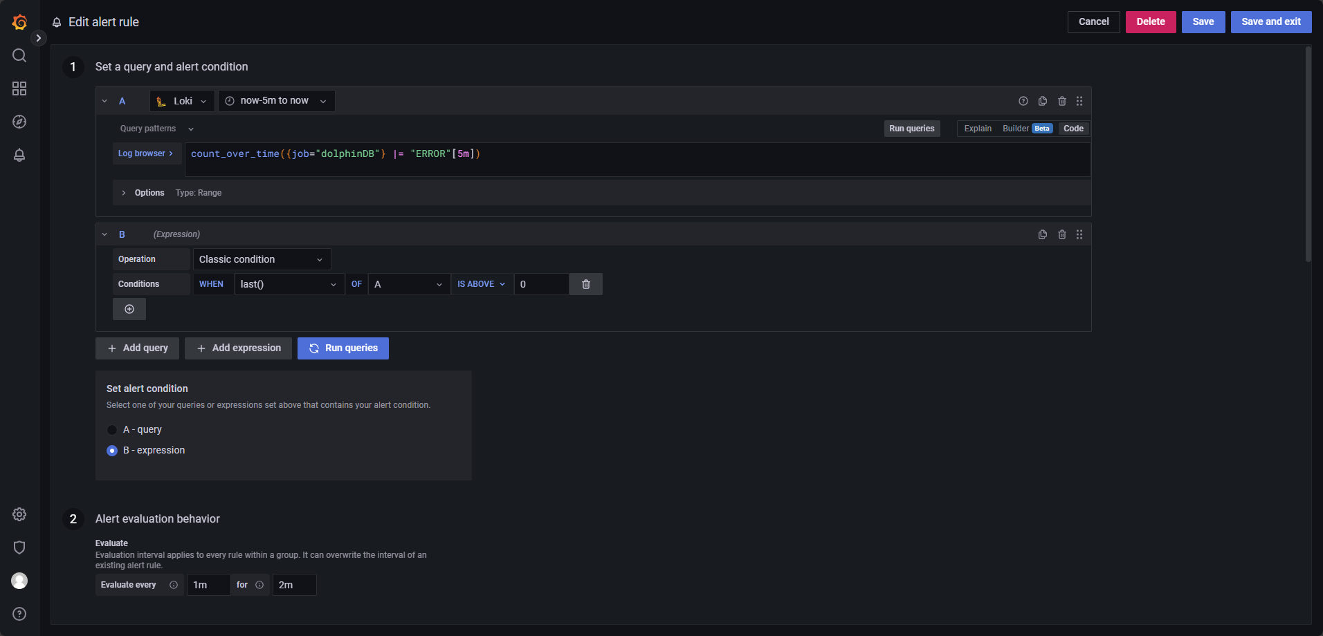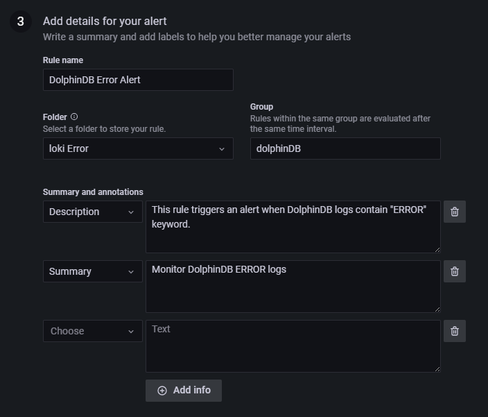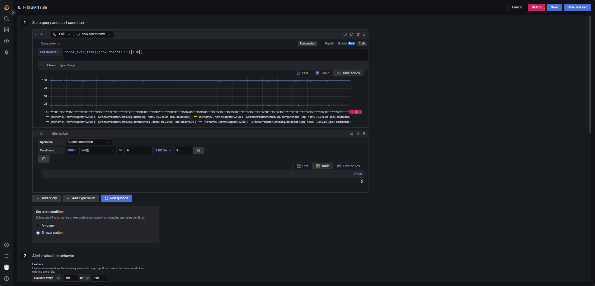 注:在解析日志的 level 字段后,对 level 字段的查询不能再以关键字搜索表示,应指定 level 标签搜索的形式表示,例,对 level=”ERROR” 的日志,LogQL 查询语句原先为count_over_time({job="dolphinDB"} |= "ERROR"[5m]),应改为count_over_time({job="dolphinDB", level="ERROR"}[5m]),告警规则也应对应进行更改。 - 告警配置中设置最短的告警评估期