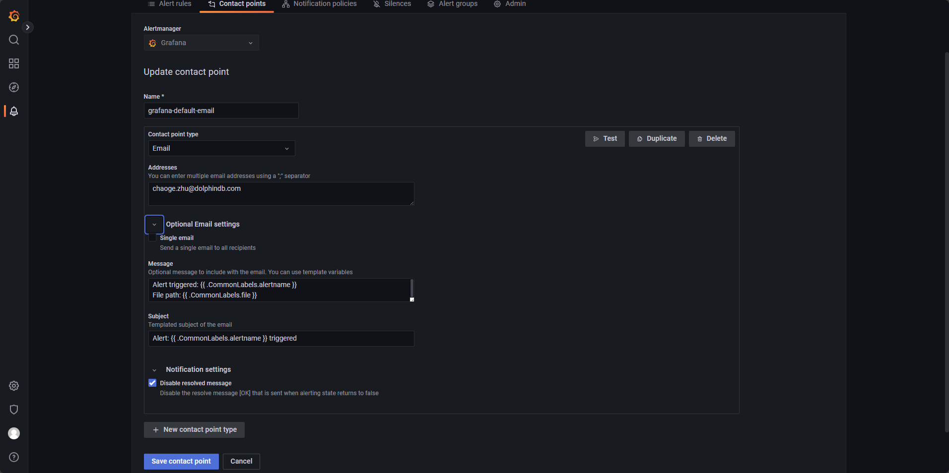Contact points,点击创建New contact point,按照图 3-12 配置即可。若想在告警邮件中加入动态标签(label)信息,可参考官方文档模板注释和标签来配置 Message 部分。图 13. 图 3-12