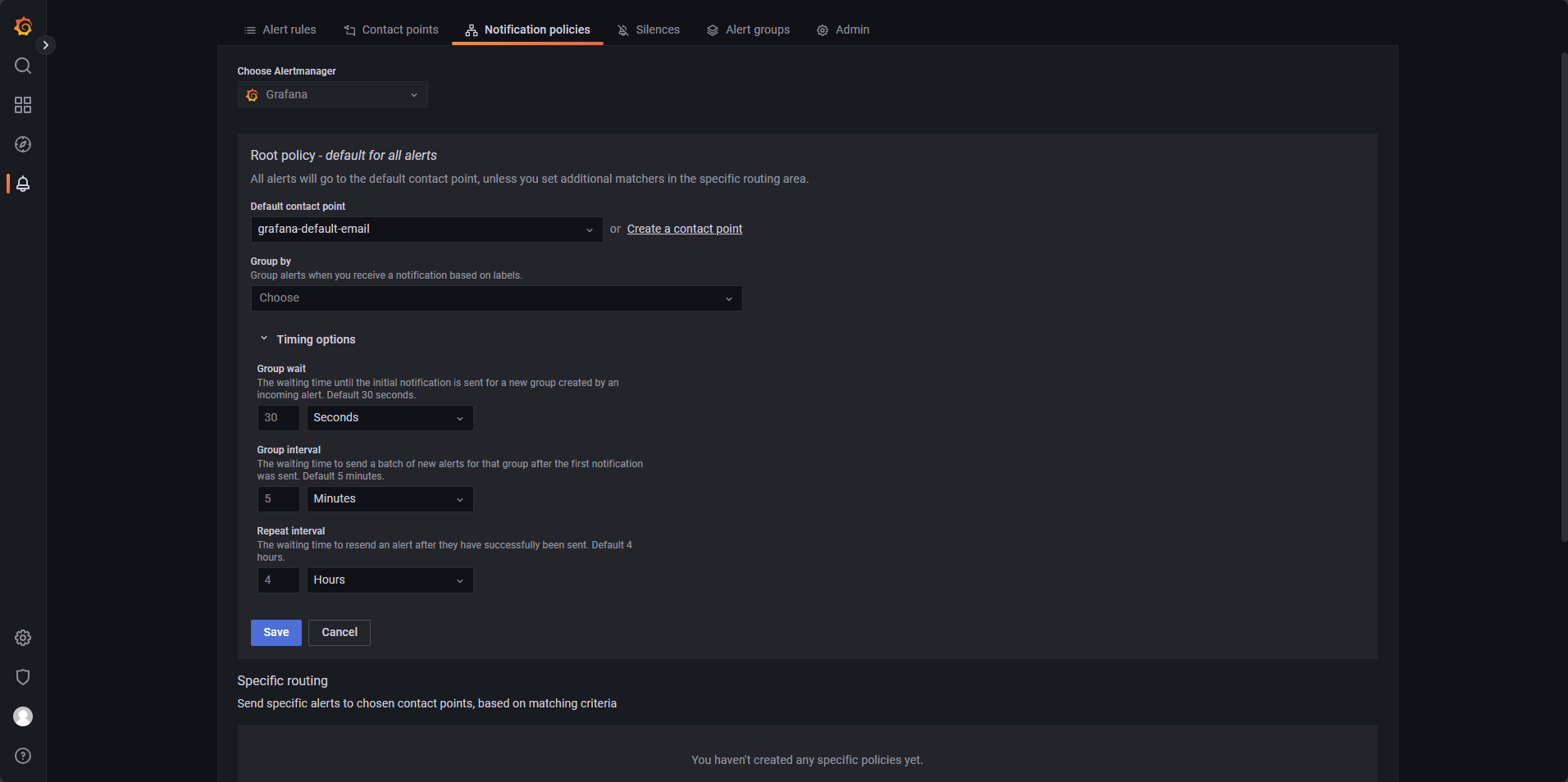 Notification policies,参考图 3-14,只需要配置告警对应的Default Contact point即可,点击 Save 保存。图 15. 图 3-14