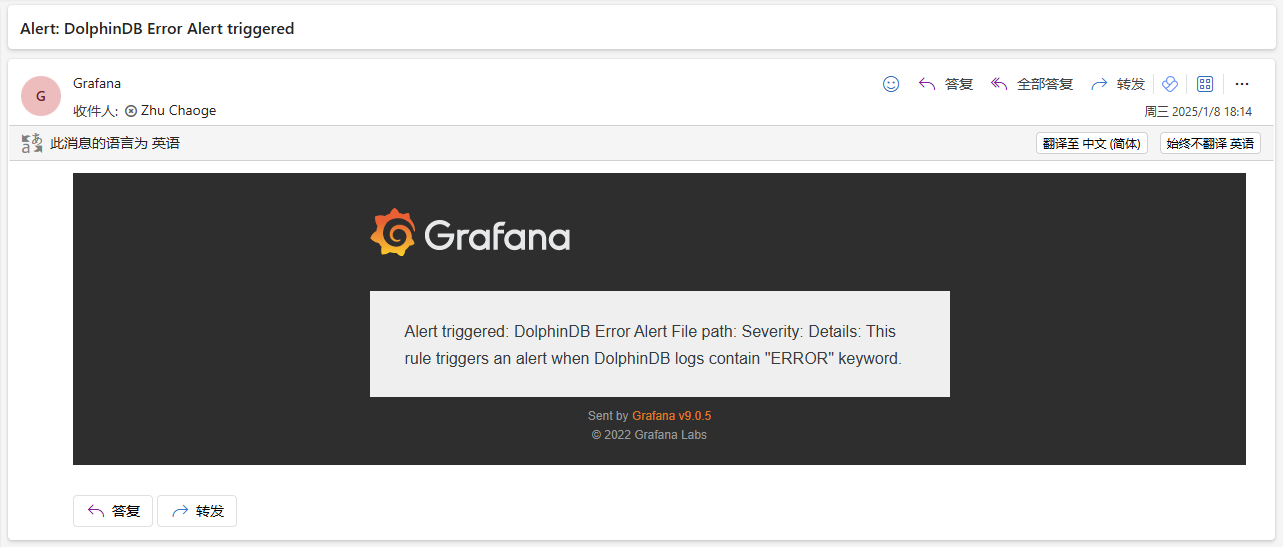 writeLogLevel(ERROR,"This is an ERROR message")写入错误信息后,设置的接收邮件会收到一封由 Grafana 发送的告警邮件,如图 3-15,若发送时间符合告警规则配置,则配置成功。