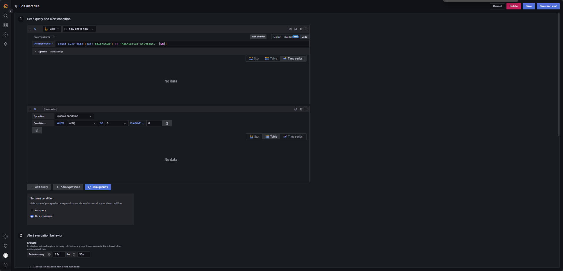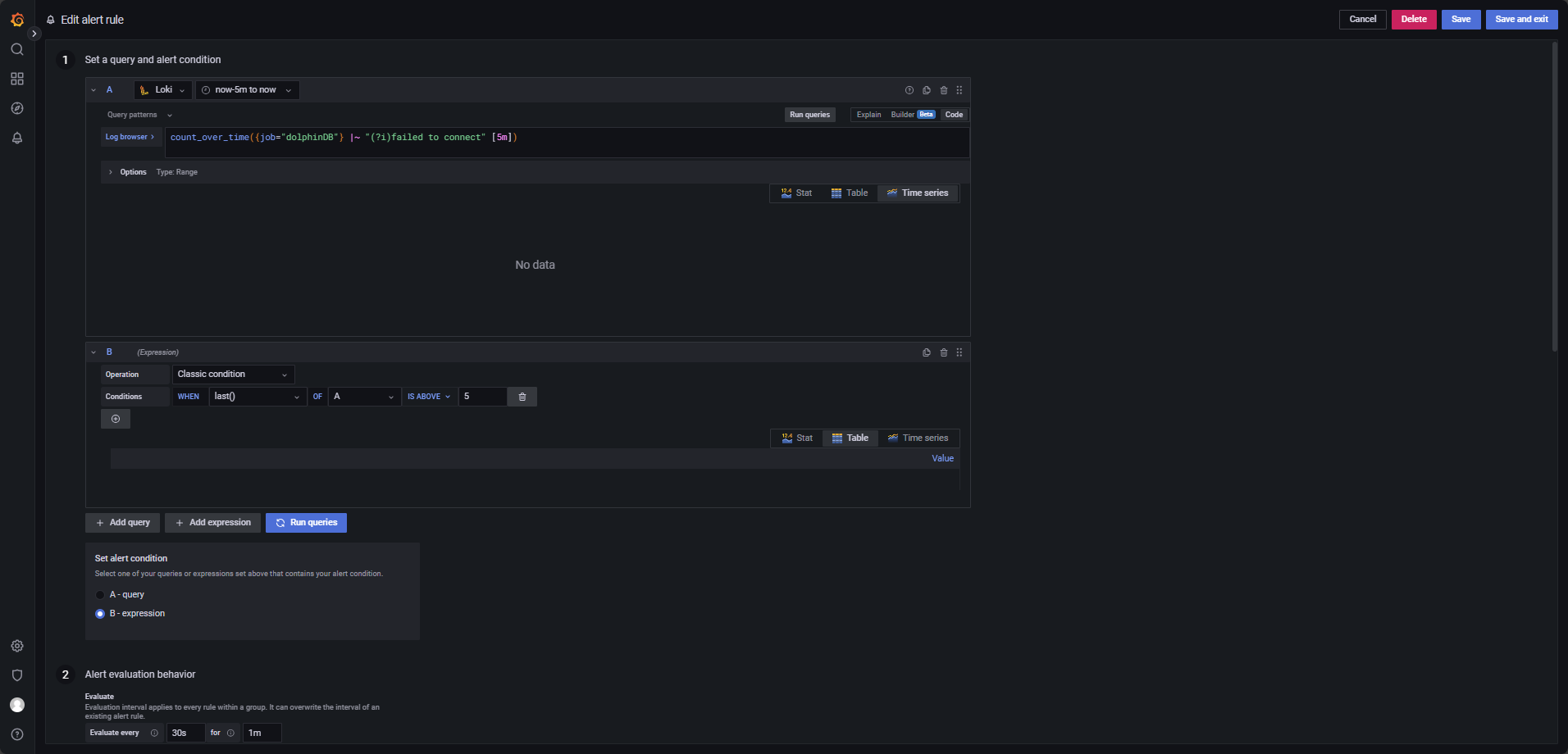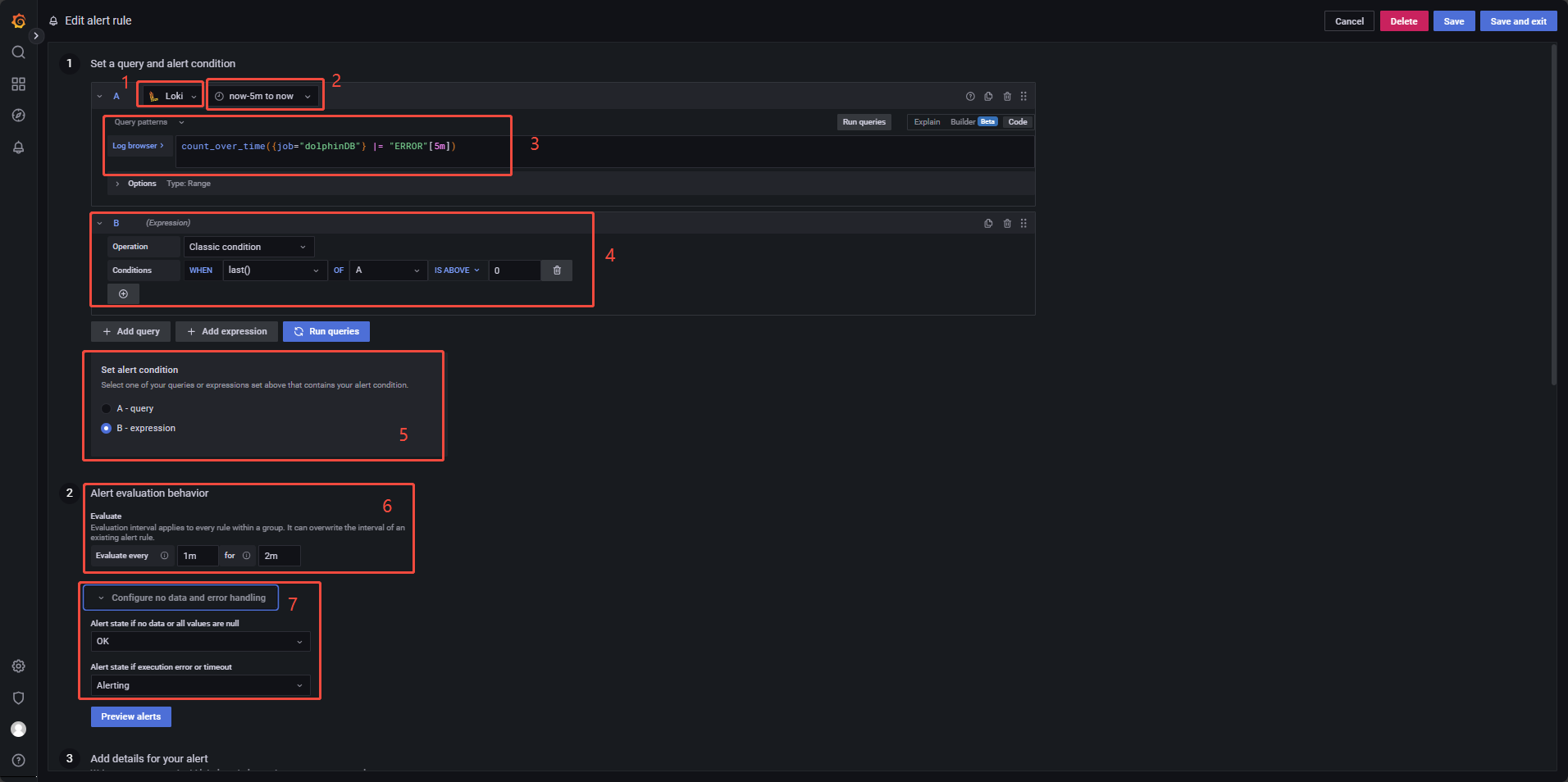 Alert Rules界面,配置告警时间等方式不再赘述,这里展示如何查询到该报错并进行告警,LogQL 查询语句如下:count_over_time({job="dolphinDB"} |= "wrong applseqnum" [5m])查询 5 分钟内,数据丢包的报错数量。并设置查询频率与评估期参数为: