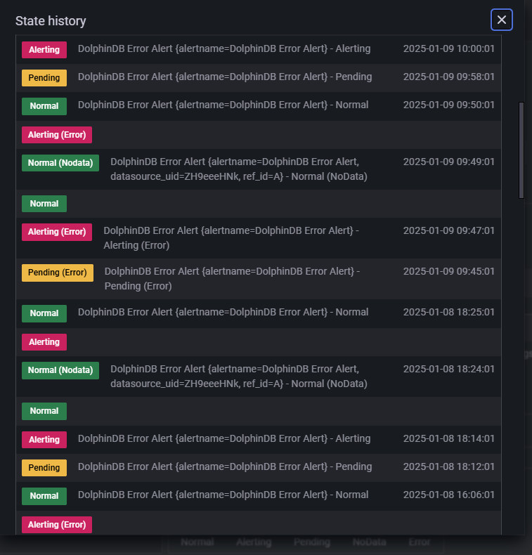 Pending表示该指标已经触发告警条件,但程序还处于告警评估期,一旦告警持续时间超过评估期,Pending就会变为Alerting警告。Nodata表示表达式查询返回值为空。Normal表示指标正常。图 10. 图 3-9