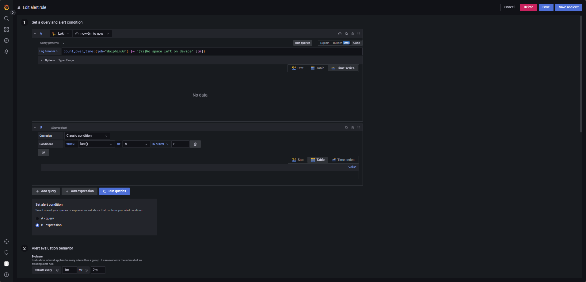 Evaluate every:15sFor:30sCondition: When last() OF A IS ABOVE 0 - 磁盘空间不足日志监控: