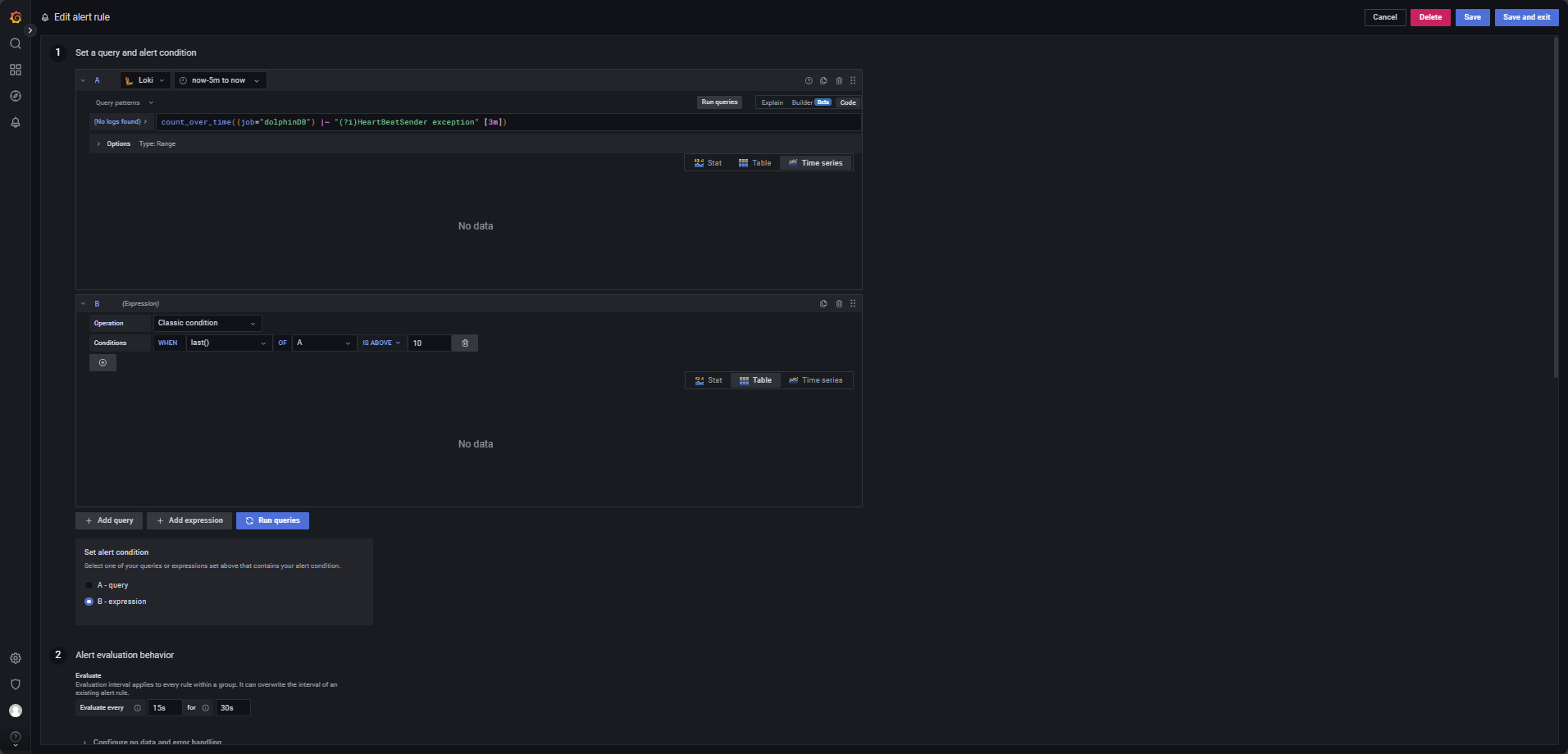 Evaluate every:15sFor:30sCondition: When last() OF A IS ABOVE 10 - 日志长时间不生成监控: