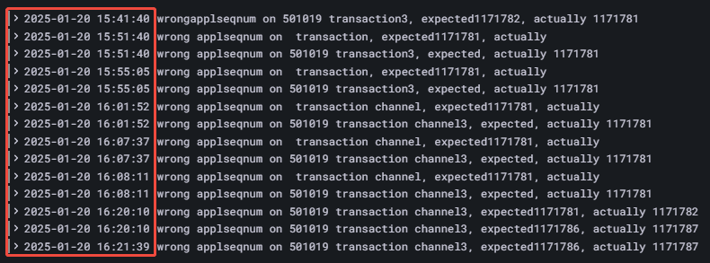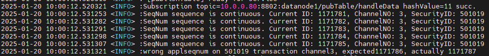 上交所发送的股票逐笔数据中,股票和基金共享同一通道,通道内(ChannelNo)OrderIndex 和 TradeIndex 按顺序排列,若其发生跳变,可视为通道异常,可以通过监控 SeqNo 字段的变化来判断是否发生了丢包。目前 insight 插件已支持逐笔数据的丢包监控日志输出,其他插件也将在后续更新中提供该功能。可通过以下方式输出日志并配置告警机制,完成丢包监控与告警。