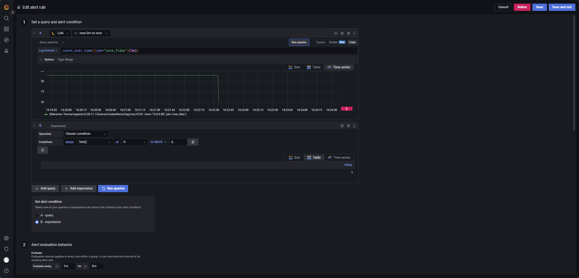 Evaluate every:1mFor:2mCondition: When last() OF A IS ABOVE 2 - core 文件生成监控: