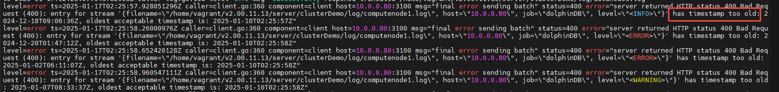 原因是现在新导入的日志的时间戳不再以日志导入 Loki 的时间作为新时间戳,而是直接解析日志原有的时间戳,因此若旧日志接受的时间戳范围超过 Loki 可接收范围,则会报错。修改 Loki 的配置文件中的