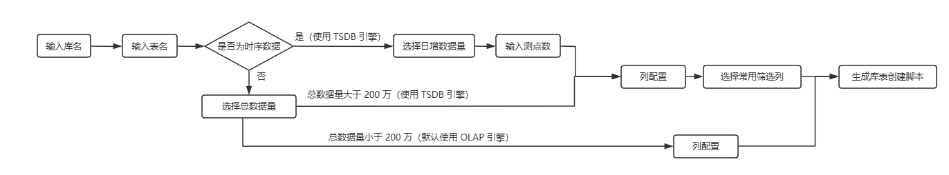 - 时序数据或者总数据量大于 200 万的非时序数据,使用 TSDB 引擎,常用筛选列第一列需为时间列,第二列需要设备编号列
