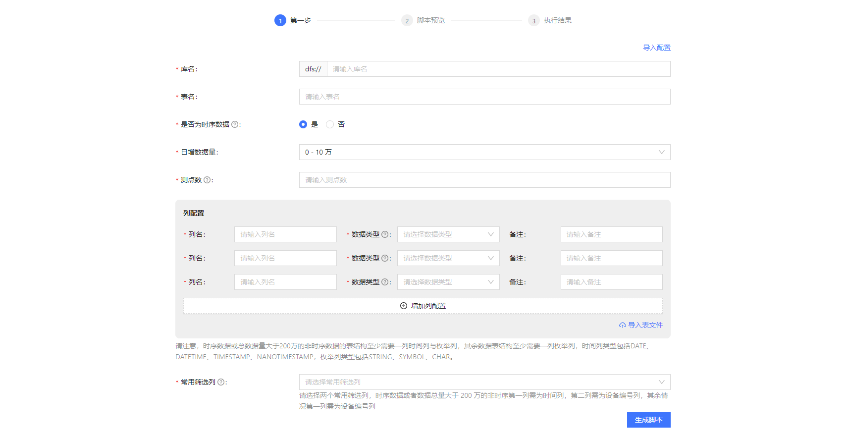 支持手动输入、本地文件导入与服务器文件导入三种配置方式- 手动输入:可以手动添加列信息,包括列名、列的数据类型以及备注信息