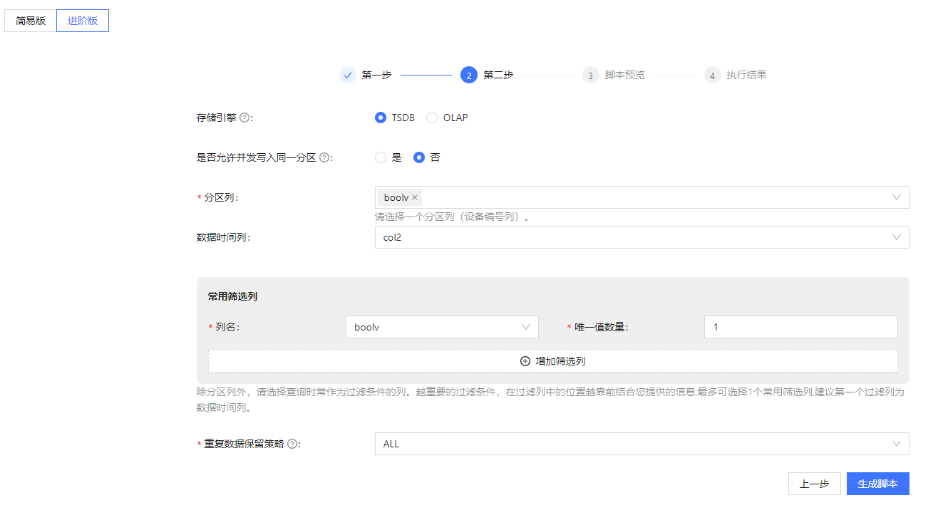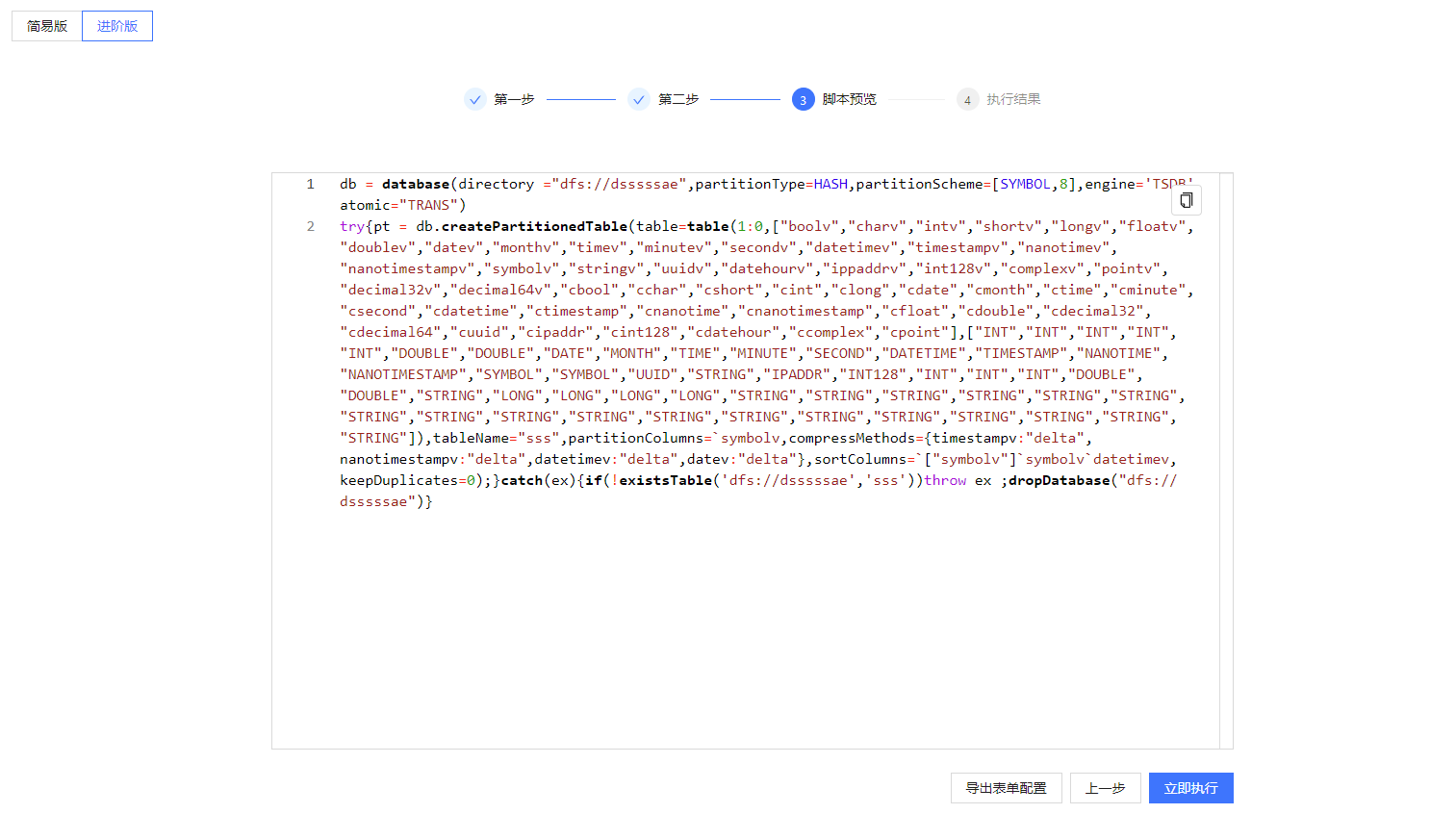 相较简易版,进阶版假设用户对 DolphinDB 比较了解,为其提供更多的高级配置,例如存储引擎、分区列以及重复数据处理策略等信息。进阶版信息填写分为两步:基本信息填写与高阶信息填写,填写步骤如图 4 所示,其中第一步填写信息与简易版一致,在此不做赘述。