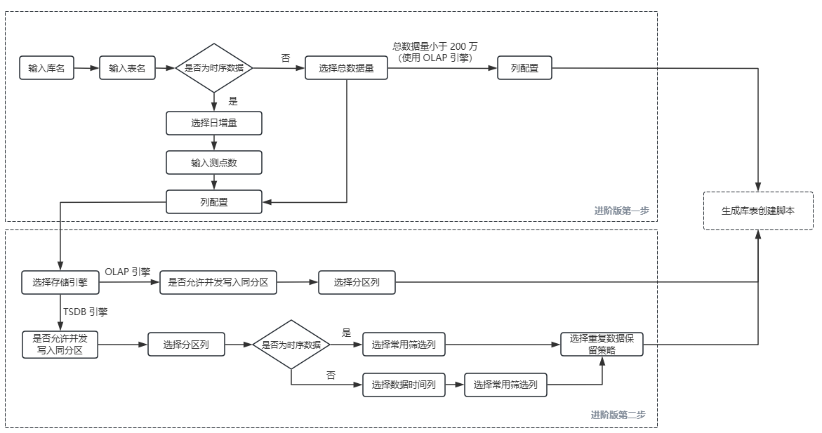 简易版将隐藏一部分数据库存储、索引相关的配置信息,如存储引擎和分区列,我们会根据用户填写的信息提供默认值,从而降低数据规划的复杂度,用户仅需按照界面表单提示填写信息,即可生成库表创建脚本,简易版步骤如图1所示。