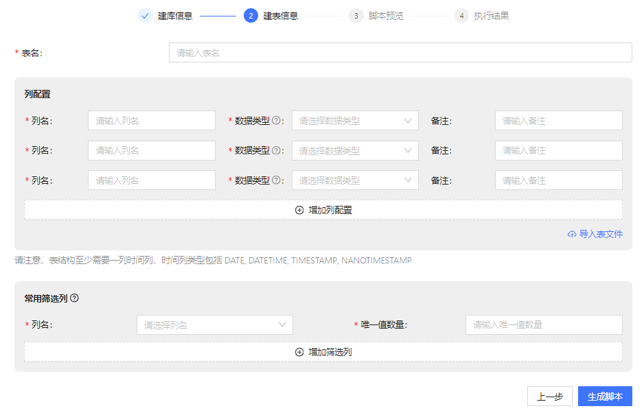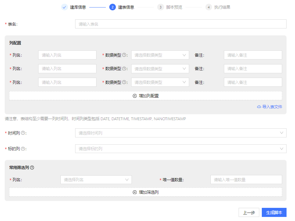 信息填写完毕点击【生成脚本】按钮即可生成库表创建脚本,脚本预览界面与物联网场景一致,此步骤可直接执行生成的脚本,返回上一步修改库表创建信息或者复制脚本进行修改。