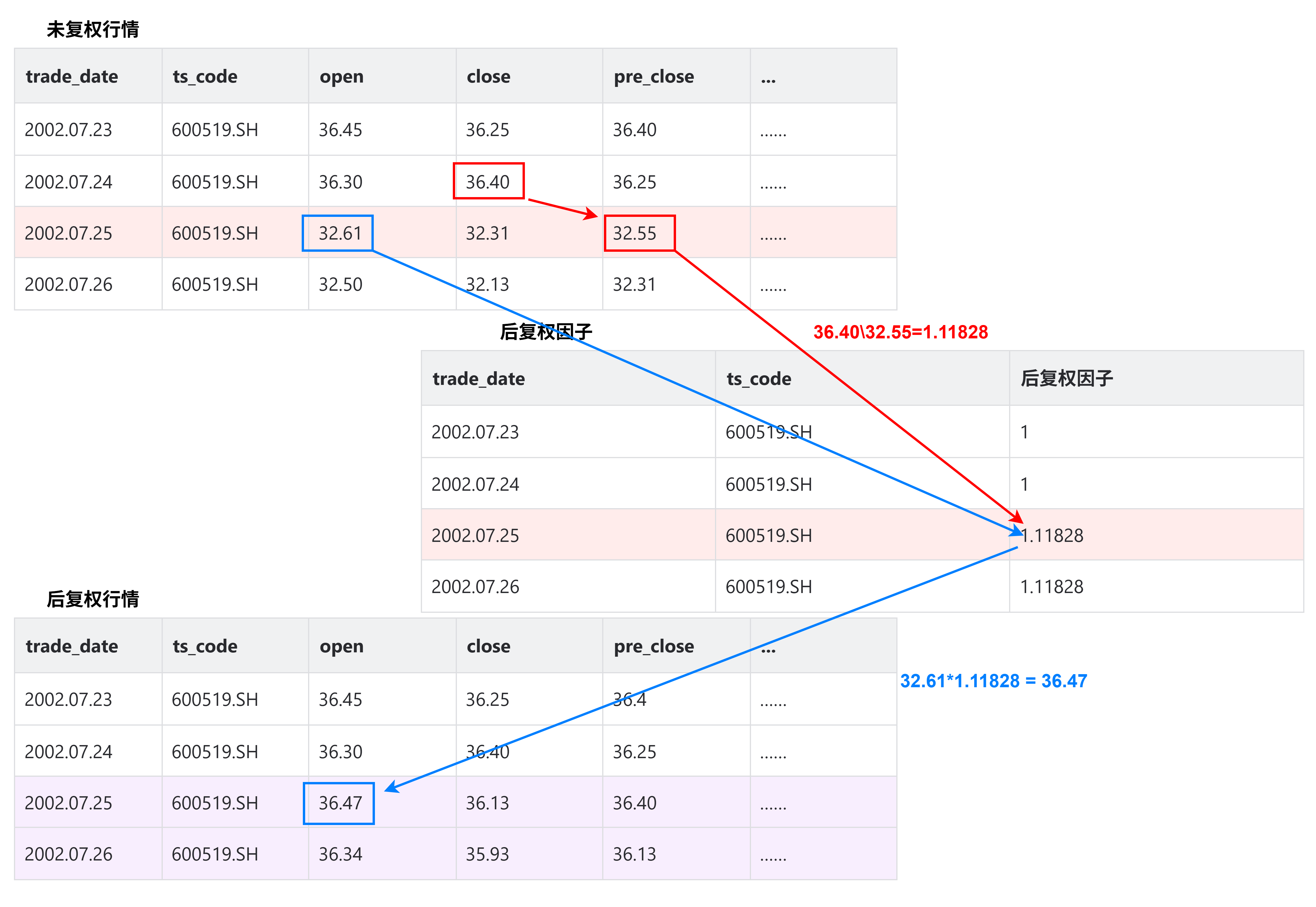 - 后复权行情等于未复权行情中的所有与价格相关的字段乘以后复权因子,图中以开盘价 open 为例展示了计算逻辑