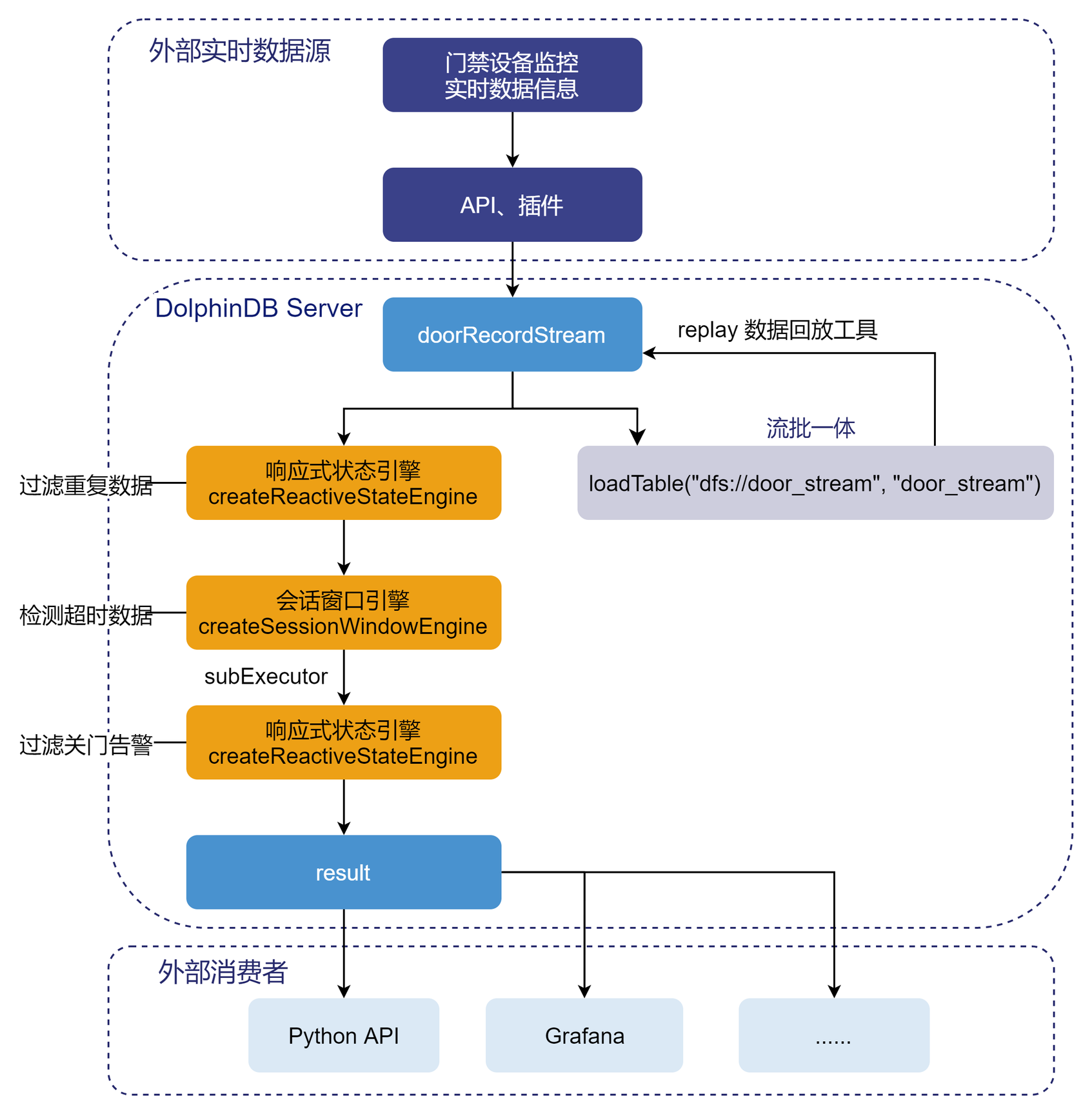 本教程基于 DolphinDB 流数据处理框架,提供了一种实时监测门禁设备异常状态的低延时解决方案,能够有效提升对于海量数据的实时计算效率,满足了门禁系统智能化的计算需求。利用 DolphinDB 流数据处理框架中引擎的流水线处理方式,实现了会话窗口引擎和响应式状态引擎级联,将开发难度大大降低。本教程旨在提高开发人员在使用 DolphinDB 内置的流数据框架开发物联网领域流计算业务场景时的开发效率、降低开发难度,更好地挖掘 DolphinDB 在复杂实时流计算场景中的价值。