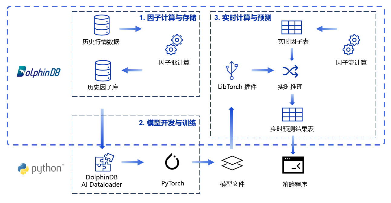 DolphinDB 作为分布式计算、存储及实时流计算一体化的高性能时序数据库,非常适合因子的存储、计算、建模、回测和实盘交易,能够很好地应对深度学习中涉及到的大规模因子计算和存储、因子实时计算等关键环节。与此同时,为了解决第三个问题,DolphinDB 先后推出了 AI DataLoader 和 Libtorch 插件等工具,以便与 PyTorch、TensorFlow 等成熟的深度学习框架紧密结合,使得用户能够将 DolphinDB 强大的数据处理能力与深度学习能力融合,从而进行高效的模型预测和数据分析。