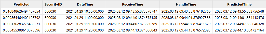 reorderColumns!函数修改了时序聚合引擎输出的因子的顺序。 - 本例在实时预测之前先调用了一次模型,作为模型预热。这并不是必选的操作,但是可以优化实时预测的性能。由于 CUDA 初始化、GPU